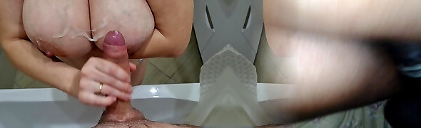 My wifey helps me wash my dick in the bathroom and gets jizm on her hefty tits for it