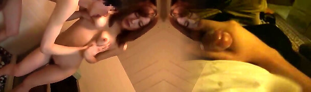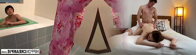 Horny Japanese honey with meaty titties and shapely assets plays with youthfull dude's xxl prick in the bathroom. She gives him a hooter bang and they