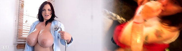 Jaw dropping curvy brown-haired MILF plays with her huge udders in the shower
