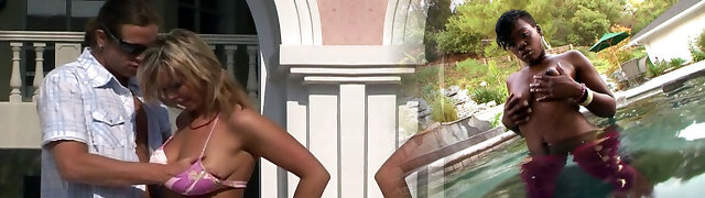 Three slutty babes get plowed by one dude by the pool + facials