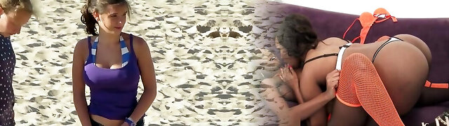 Sexy bootyful dark haired bikini chick Cassie rides cock mad on the beach