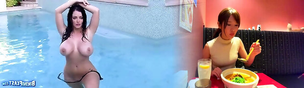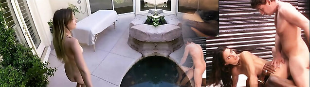 Big backside Chinese Connie Perignon teases by the pool and gets fucked