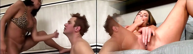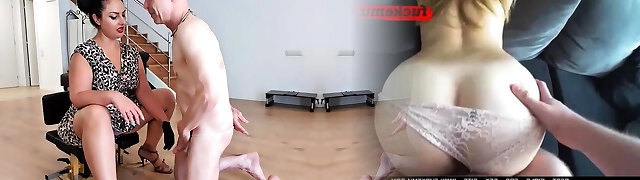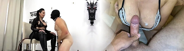 vollbusige brünette herrin melkt ihren sklavenschwanz und lässt ihn danach das sperma von ihren nylons lecken