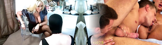 sexy vollbusige blonde milf melkt den hängenden schwanz ihres sexsklaven und lässt ihn in seinen eigenen mund spritzen