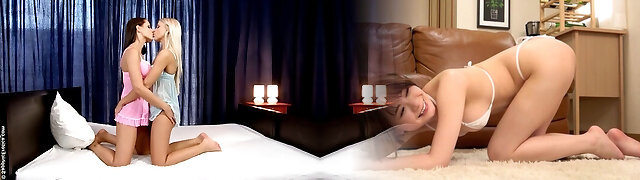 Girls in baby women strip in couch and kiss titties with lust