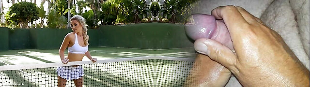 Towheaded tennis hottie unclothes on the court and flaunts her pussy