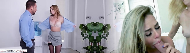 Big jugged blonde, Brandi Love is making love with Karlee Grey, in her meaty office