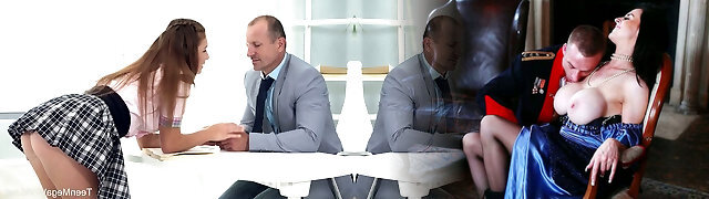Obscene sexy coed lady in uniform Mia kisses tutor and gets poked on the desk