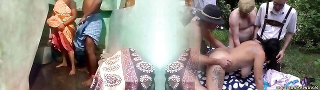 Sex slave wife bondaged and used by several fellows outdoors
