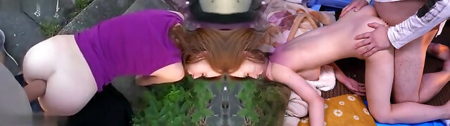 Two cute and charming brunette lesbians eat coochies on the pink rag outdoors