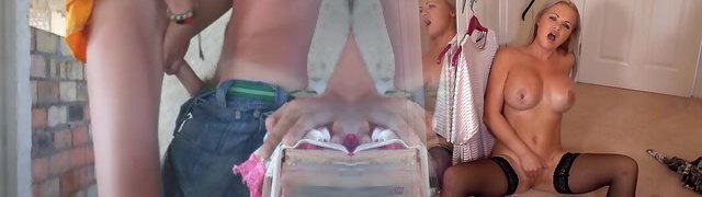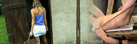 Blond babe cunt thumbs in shed after hard work in garden