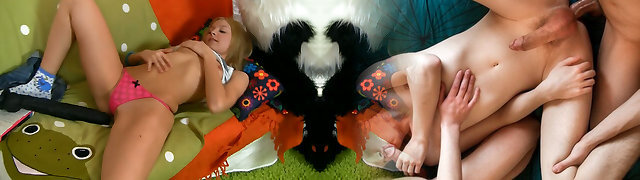 Sweet platinum-blonde teen Sveta masturbates by the toy panda