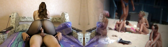 An excited bitch in transparent pantyhose passionately strokes her pussy.