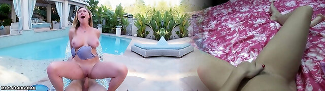 Guy enjoys fucking hot milf Rachael Cavalli and her red haired stepdaughter by the poolside
