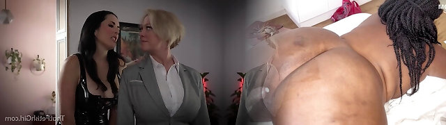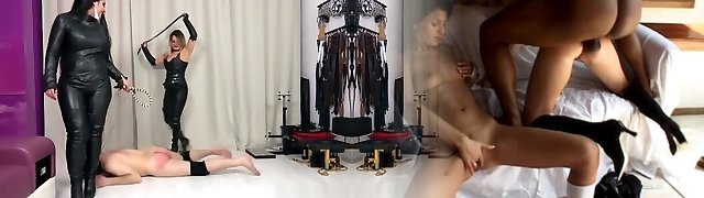 сексуальная подтянутая брюнетка госпожа играет в эротические и горячие бдсм игры с мужчиной в наручниках и послушной грудастой блондинкой