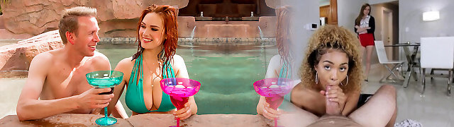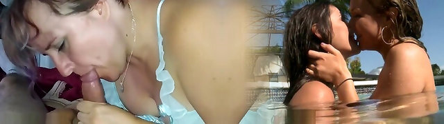 Lewd blonde Nathaly Cherie gives a rimjob and blow-job by the poolside