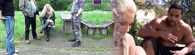Pretty blonde licks black nads and swallows huge big dick outdoor