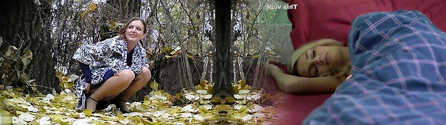 Bride struggles with her wedding dress as she pisses in the woods
