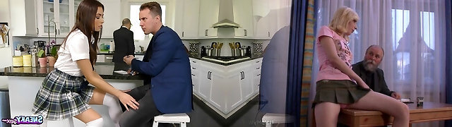 Teeny schoolgirl fucks with Bf and invites buxomy stepmom for 3some