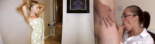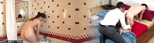 Spunky and bitchy brunette catches big white dude naked in the bathroom