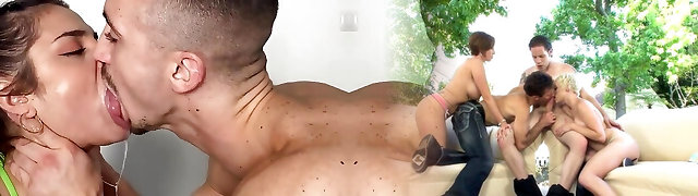 Three black dudes and one blond woman punish curly pretty chick