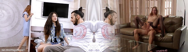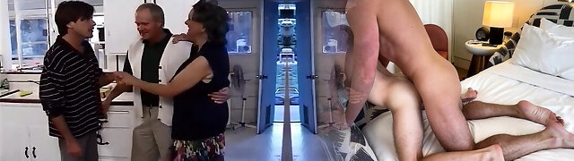 Slender brown-haired caught a young guy sucking his stepdad's cock and then she joined them for a excellent ac/dc threesome