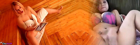 Molten big breasted auburn MILF Ashley Rider faps in the sauna