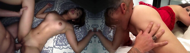 My dad rub raw and itchy pussy of his young female paramour on bed
