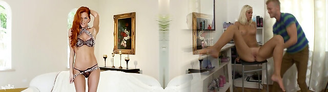 Alluring long legged redhead in sexy lingerie Jenny Blighe thumbs herself