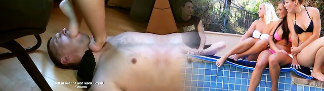 Horny Russian mistresses making the skimpy guy lick their sex soles