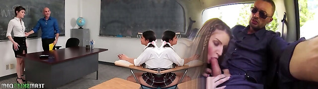 Smoothly-shaven headed teacher is fucking two sex-hungry school chicks on the table