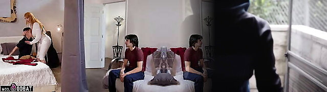 MILF Lauren Phillips tag teamed by her 2 stepsons thru a curtain