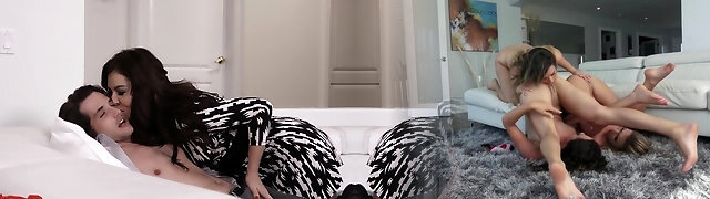 tre amatoriale chics cazzo al di fuori con cornea freaky tizio, sperma facciale incluso