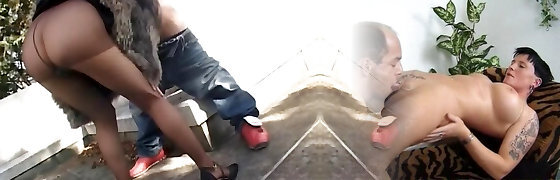 enorme boobed cougar in collant immerge un uomo di carne nel profondo del suo culo