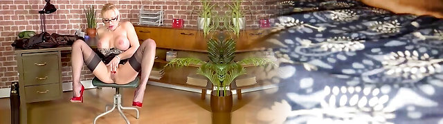 towheaded enormi tette assistente si masturba sulla scrivania in calze di nylon e scarpe col tacco alto