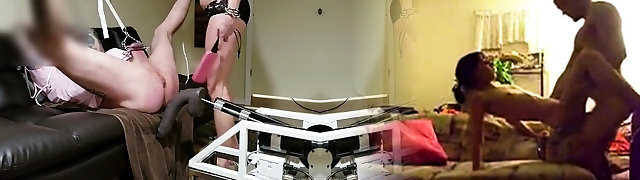 A few beautiful chicks have fun with a fucking machine during pajama soiree