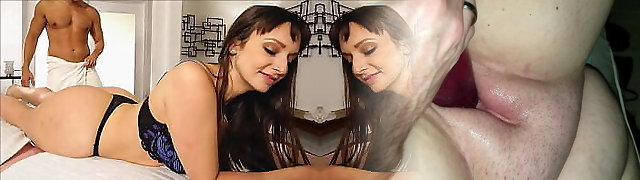 Romantic lovemaking on the massage table with oiled Tru Kait