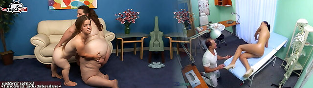 Busty brunette BBW toying with two midget lesbians