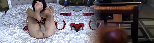 Christmas high heels and nylon stockings get covered with a big load of cum part 1