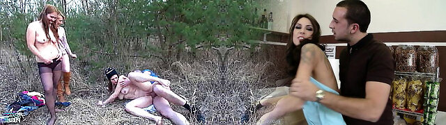 Three fledgling chics fucking outside with horny weird dude, facial cum included