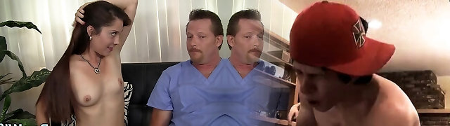 Hot n sexy slut enjoys dick sucking and cootchie munching with two mature guys before getting fucked in both holes by them