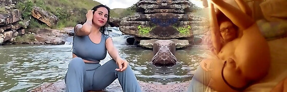 All alone fantastic busty babe Milla wanks her twat near the pond