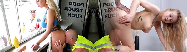Big ass juicy platinum-blonde gets a hard fuck from a builder in a food car.