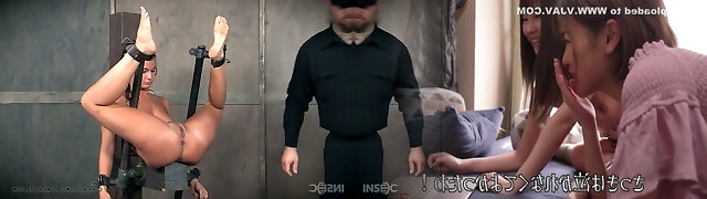Shackled nude brunette whore stretched on the wood