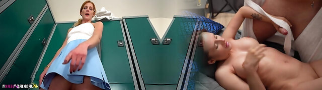 Some nice and lollipop getting bigger upskirt solo show by slutty girl in locker room