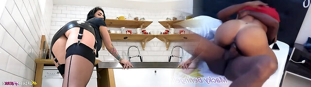 Jaw ripping off plump black-haired in latex outfit and stockings Maxi is flashing her pussy upskirt