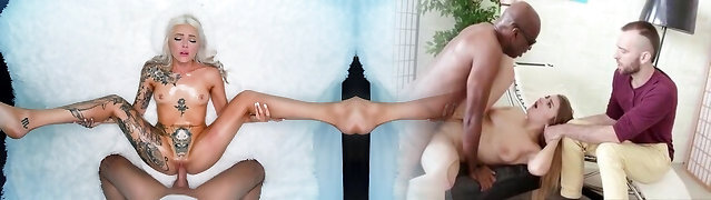 Super-hot sandy-haired bi-atch hungry for BBC sex enjoys slurping her friend's huge monstercock and then asks him to destroy her pussy