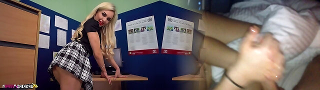 Torrid blondie coed girlie Beth flashes her clean-shaven pussy near the blackboard