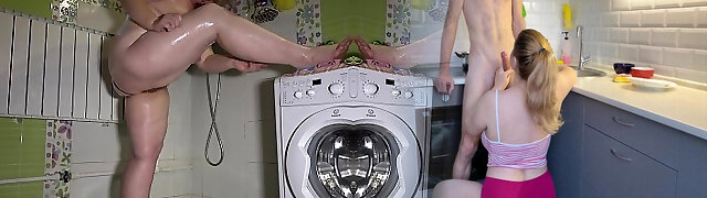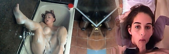 The husband put a covert camera in the shower to spy on his wife. A cougar with a hairy twat and big tits is washed at home.